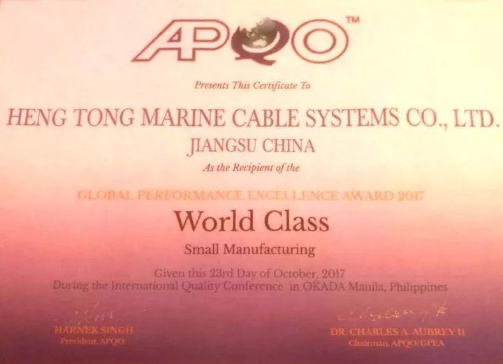 Companies who apply for the global excellence performance award must be have achieved the National Quality Award of the member States of the Asia - Pacific quality organization, which sets a high quality standard and provides a platform for international competition. Through this award Hengtong Marine is recognized as having quality management systems which are of international standards.