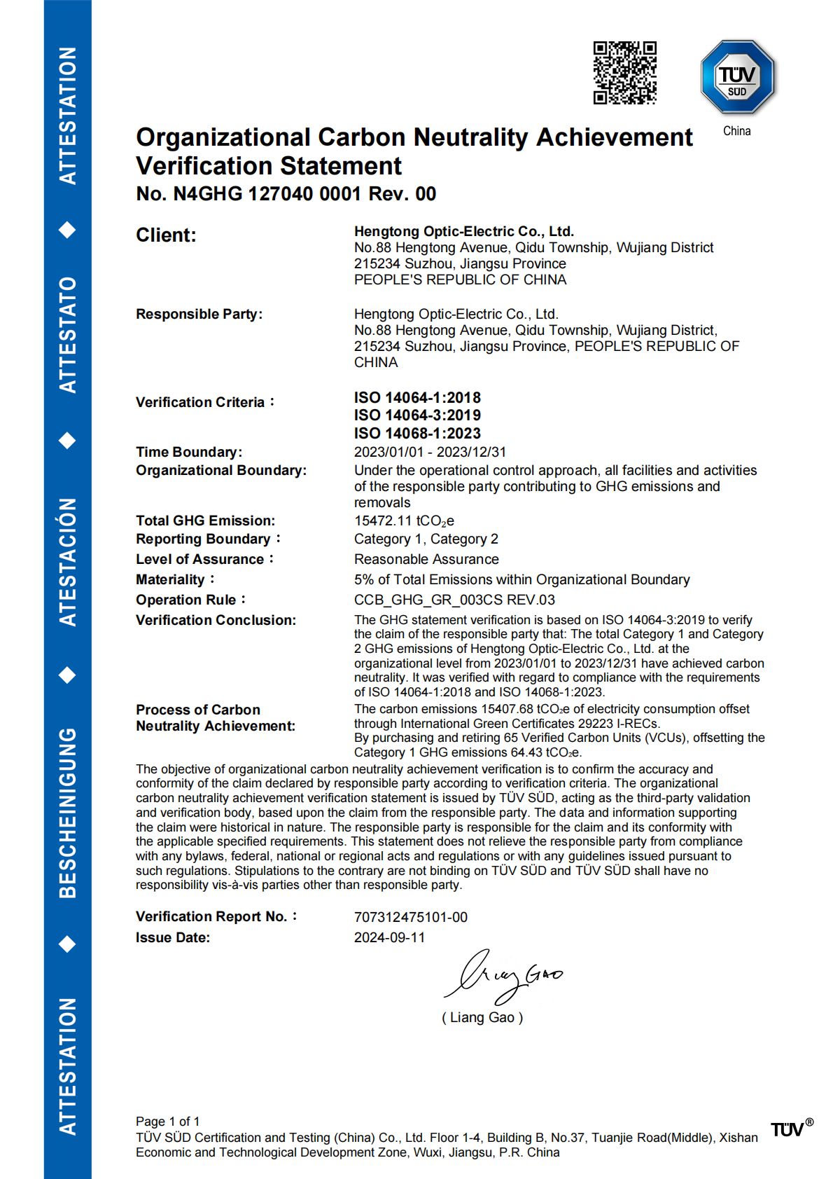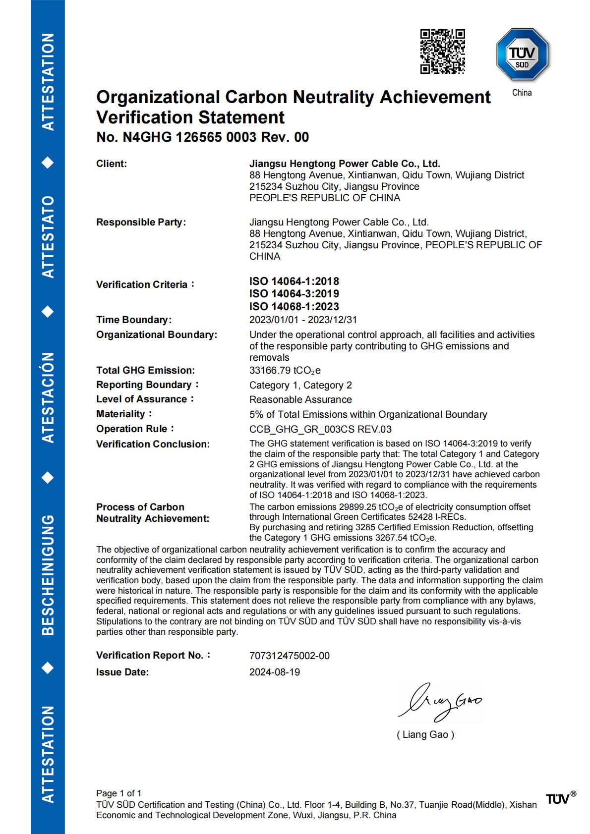 Four companies under the Hengtong Group have achieved the Organizational Carbon Neutrality Verification Statement in accordance with ISO 14068 standards.